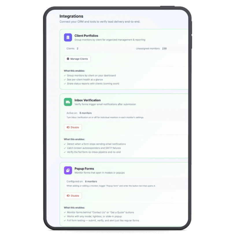 Keep a constant pulse on your critical lead capture forms. Get immediate status updates so you know exactly when a form stops working.