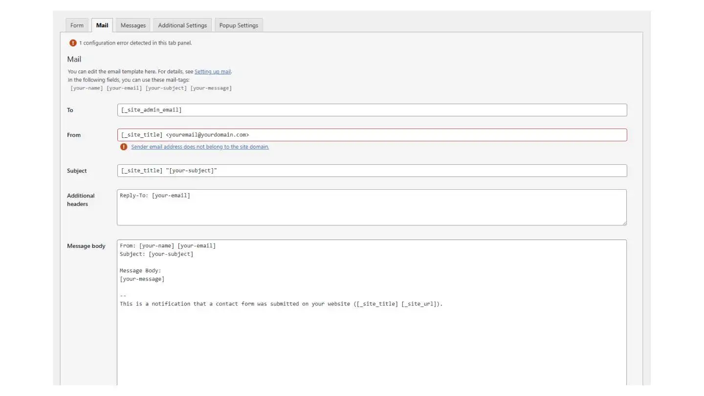 "Sender email does not belong to the site domain" โ you're using a Gmail, Yahoo, or Hotmail address in the From field. Change it to an email on your own website's domain.